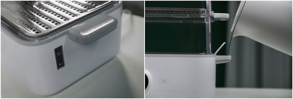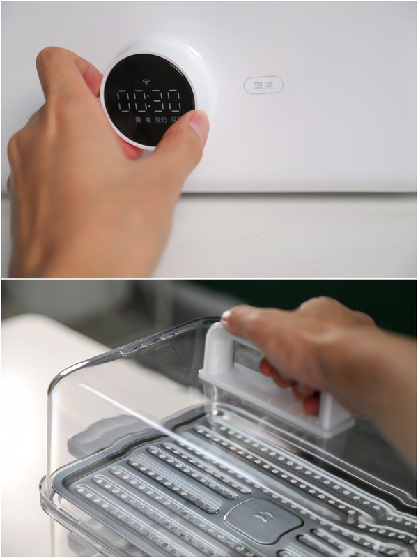 机体之外,便是蒸蒸笼、蒸架以及锅盖,它们均采用了食品接触级材质,其中锅盖顶盖设有超大弧形天窗导流,帮助蒸汽产生的水流精准滑落到四周,让蒸食不再湿漉漉。此外,机器内部设有可拆卸的接水盘,避免烹饪时蒸发余水产生异味,同时方便清洗汤汁和残渣。