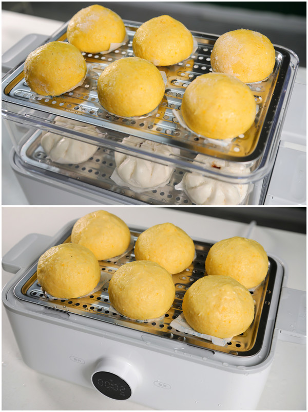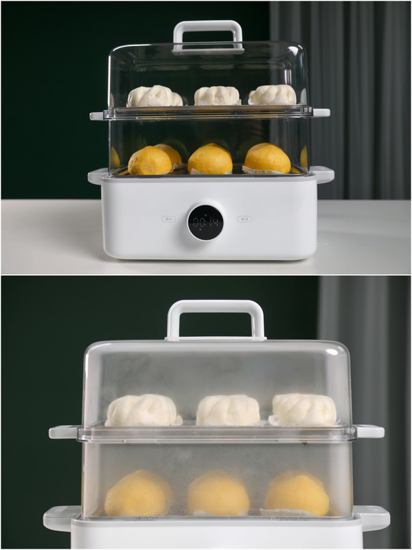 我们选择了冷藏的菜团、叉烧包进行测试,从烹饪前后的食物对比上看,蒸制效果一目了然。原本冰冻状态下、表层还有些起霜的菜团、叉烧包,从里到外都变得松软无比。而且15L大容量,一次可以蒸两层,哪怕是一家四口的早餐需求,它都能既省时又省力的完成。