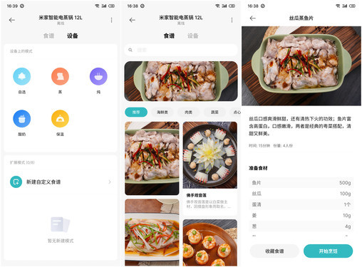 从功能上说,它除了有常用的调节,还能通过米家APP进行预约操作、使用,同时其内置了许多菜谱,可以根据菜谱进行食材的搭配,实现一键启动,这对于一些厨房小白来说,上手没有任何难度,就像使用一件电子设备一样。