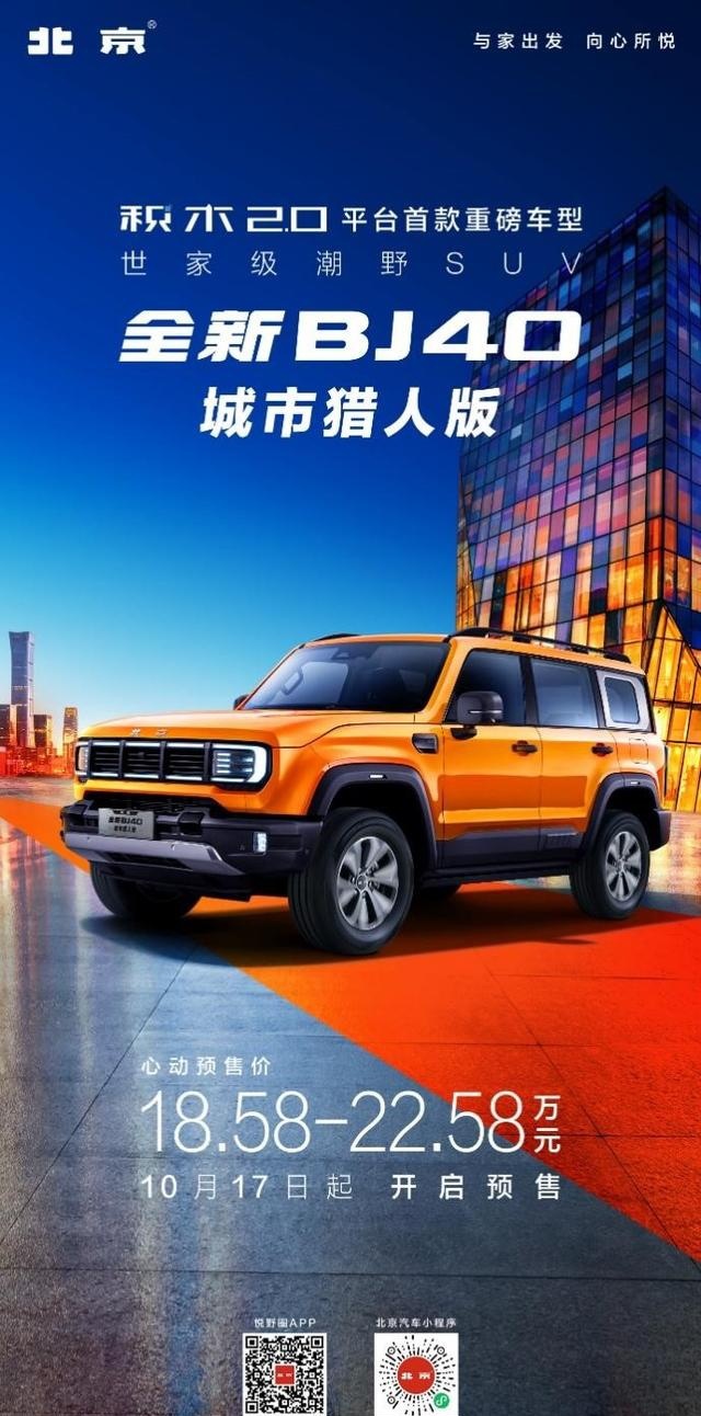 10月17日,全新BJ40城市猎人版正式预售,车型分为先锋型,预售价格为185800元;侠客型,预售价格为205800元;至尊型,预售价格为225800元。价格一出,迅速出圈,一直饱受关注,实力能打的全新BJ40,这一次再次向广大新老用户拿出了十足的诚意。
