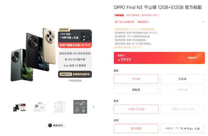 据了解,OPPO Find N3拥有千山绿、潜航黑、日志金三款配色,12GB+512GB版售价9999元。此外,OPPO Find N3还拥有全新的典藏版,16GB+1TB,尊享VIP模式,售价12999元。除潜航黑,典藏版还拥有赤壁丹霞专属配色。