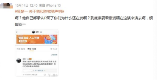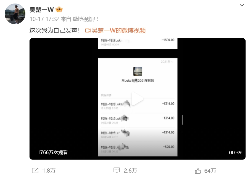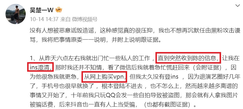10月17日,吴楚一发出第四条微博,为自己发声。