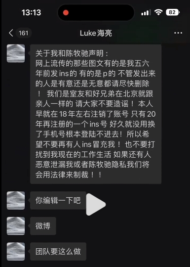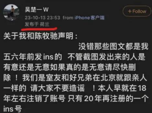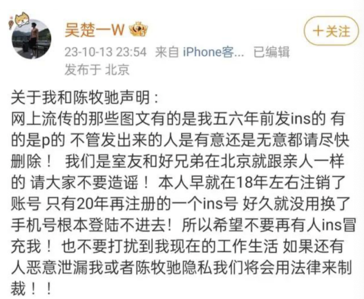 在爆料后的两个多小时后,吴楚一在微博进行回应——自己和陈牧驰是室友,更是好兄弟。