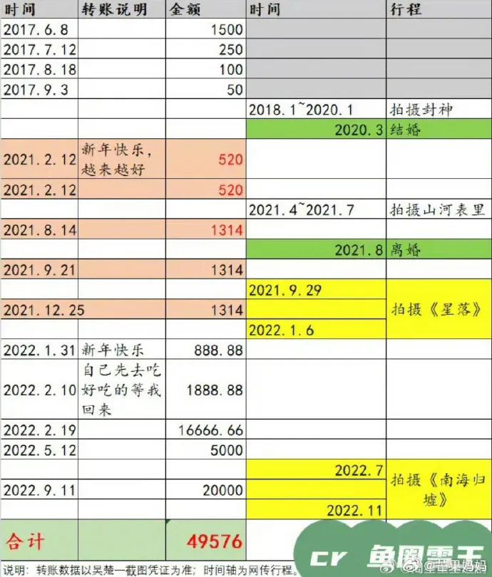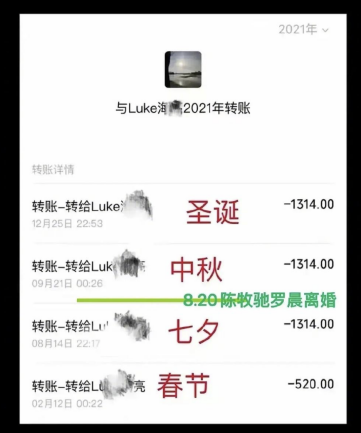 此外,吴楚一还晒出了之前多次给陈牧驰打钱的截图,转账中多次出现 "1314"、"520" 等特别的数目,眼尖的网友也发现,转账的日子中有情人节、圣诞节、元旦等节日。而其中有几笔转账的时间,更是在陈牧驰和前妻未离婚前。这也让更多网友怀疑起陈牧驰的人品。