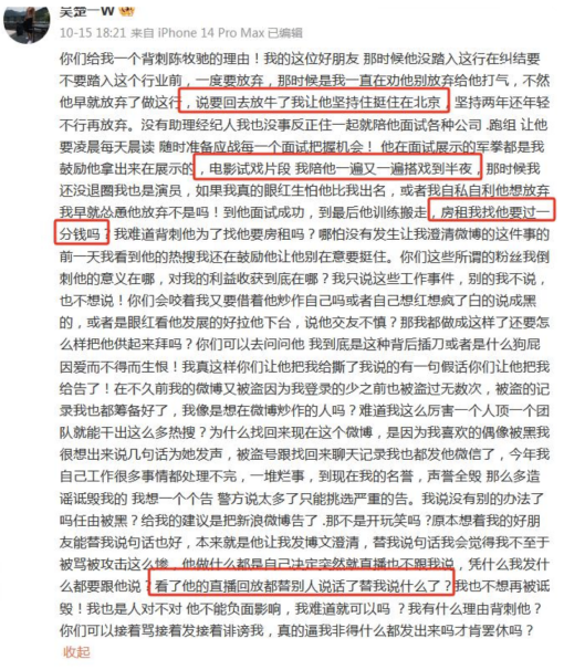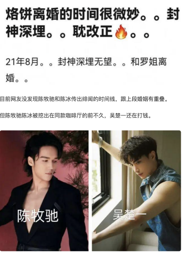 15号,吴楚一发文爆料和陈的过往——当年是他鼓励陈牧驰坚持北漂、混娱乐圈,陪陈搭戏到半夜,房租都是他出。是陈要求他发文澄清,导致他现在被诋毁。本以为好朋友能帮他说句话,但陈直播里就没维护过他。