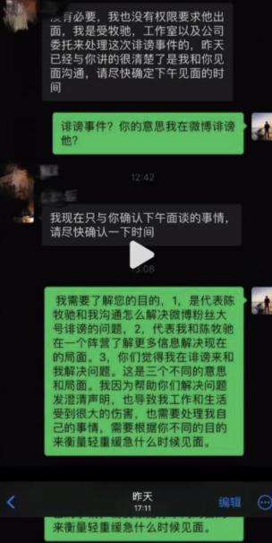 在吴楚一发出第三条微博后,陈牧驰拉群找了律师,两人本来说好了要面谈,可陈突然退群,留下吴楚一和律师单独谈。而在谈话中,陈牧驰方律师的言辞却让网友觉得这是在故意套话,要获取吴楚一诽谤的证据。