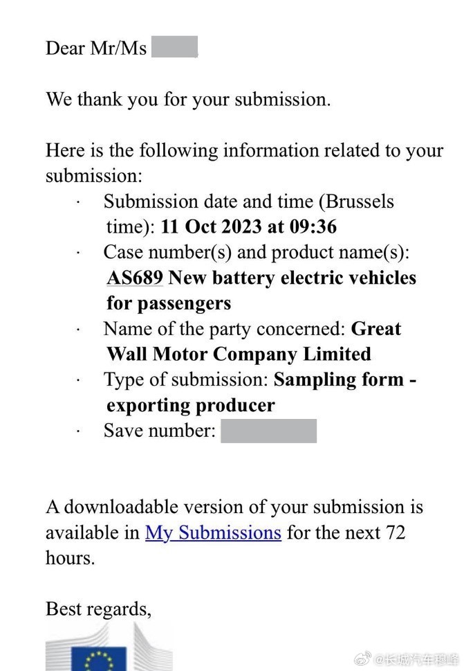 DoNews10月23日消息,长城汽车总裁穆峰23日在微博透露,对于欧盟反补贴调查,长城汽车已经于11日第一个提交应对材料。