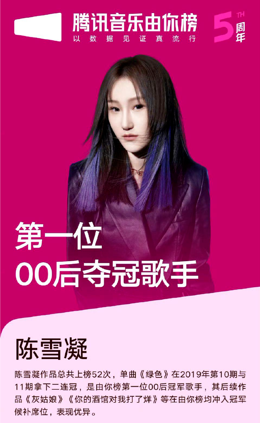 2019年2月,陈雪凝发行了她登峰造极的现象级大爆单曲《绿色》。这首歌曲在网络上迅速传播,成为了中国近年来备受瞩目的现象级歌曲。《绿色》在腾讯音乐由你榜上夺冠,也让陈雪凝成为了首位00后夺冠歌手。