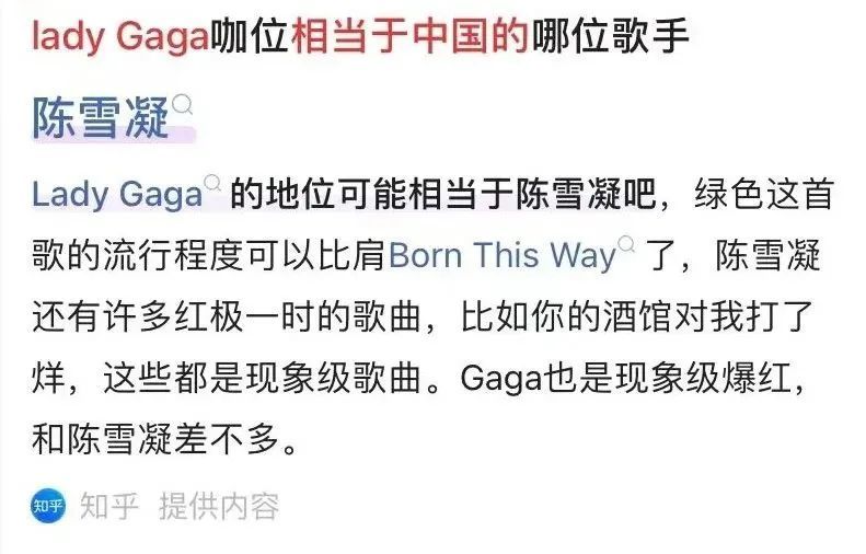 陈雪凝还被誉为中国版 Lady Gaga,她们都是非常有才华的歌手,能够在音乐领域中独树一帜,展现出自己的特色和风格!无论是Lady Gaga还是陈雪凝,她们都以独特的表演风格和音乐才华赢得了大众的喜爱和认可。