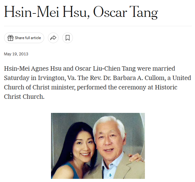 ▲2013年5月,74岁的唐骝千和41岁的徐心眉走入婚姻殿堂,婚讯同样登上了《纽约时报》