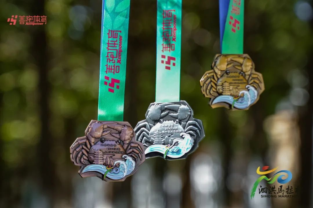 马拉松奖牌既是对选手的肯定也是一座城市形象的缩影。奖牌的形象以螃蟹作为整体造型设计,充分体现了泗洪县“中国螃蟹之乡”的特色。正面融入了泗洪古徐阁地标与洪泽湖浪花元素,凸显了泗洪厚重文化底蕴与大湖湿地生态之美。奖牌背面特别增加铭牌设计,跑友可雕刻自己姓名并嵌入完赛奖牌,让每位完赛跑友都拥有专属的马拉松完赛奖牌。