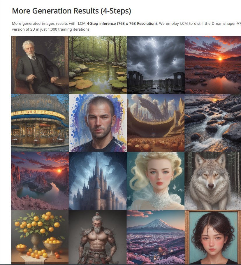 LCM可以从预训练的无分类器引导扩散模型中有效地提取出来,在只需要32个A100GPU小时的训练时间内,就可以生成768×768分辨率的高质量图像。以往我们用 SD 生成图片起码需要20步的推导步骤,但是使用 LCM 只需要4步就行,从一些测试结果看6-8步可能是一个理想的步骤。