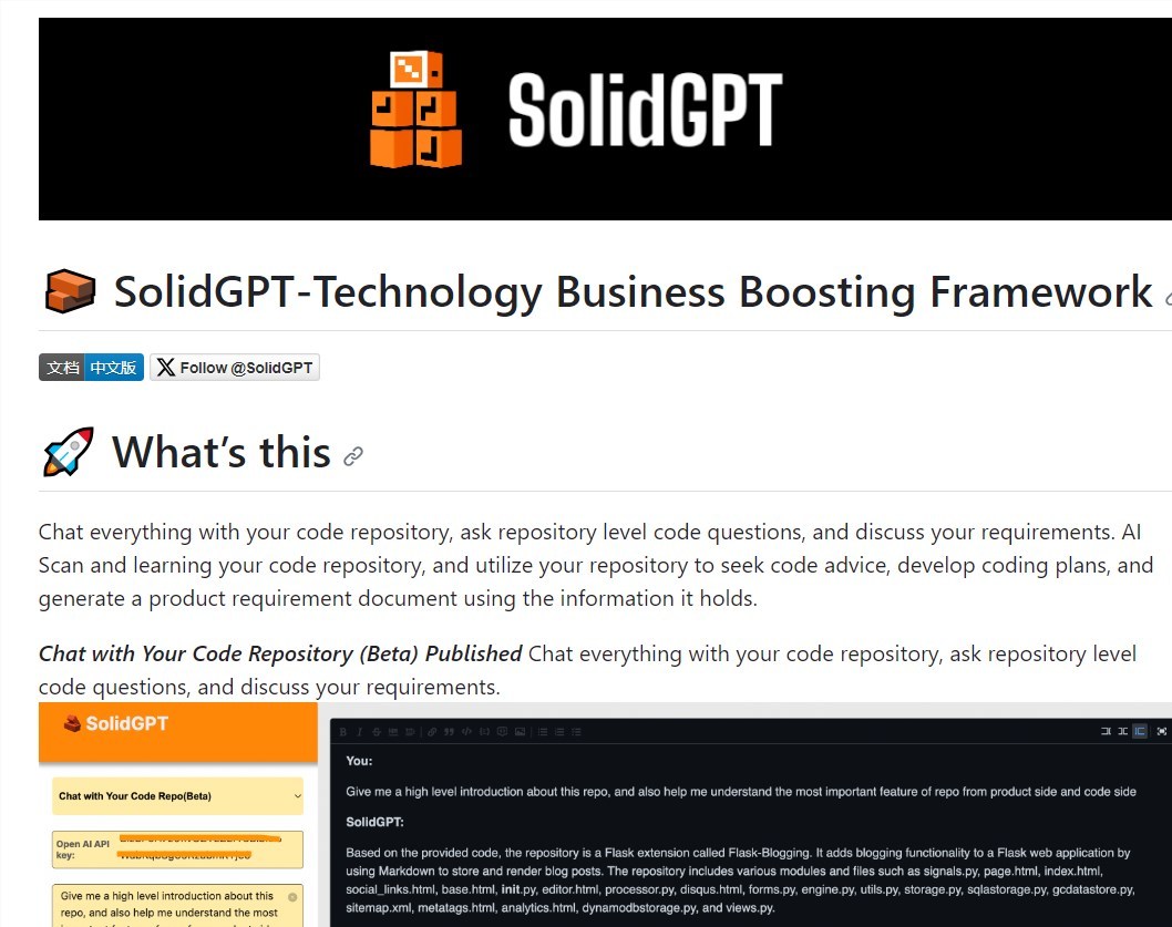 总之,SolidGPT是一款基于GitHub的人工智能工具,旨在提高代码仓库的智能程度。通过与用户的对话、自动生成注释和文档以及自动识别和修复错误等功能,SolidGPT能够帮助开发者更好地理解和学习代码,提高代码质量和减少错误率。这款工具的推出将为开发者带来更高效的工作体验,并推动软件开发领域的进一步发展。