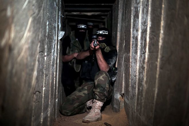 2014年8月17日,哈马斯下属军事组织卡桑旅在加沙城舒贾亚附近的一条隧道中进行部署。