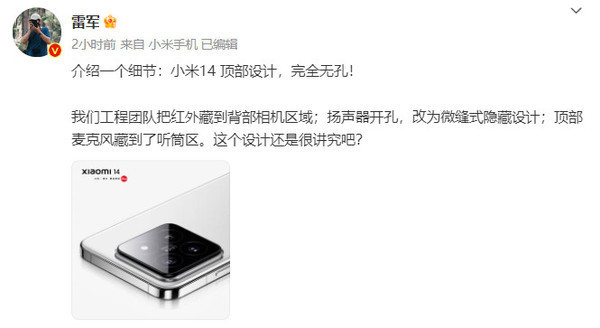除此之外,小米创办人,董事长兼CEO雷军还介绍了一个细节:小米14顶部设计完全无孔。工程师把红外藏到背部相机区域;扬声器开孔改为微缝式隐藏设计;顶部麦克风藏到了听筒区。使得中框看上去更加整洁,手机一体感更好。