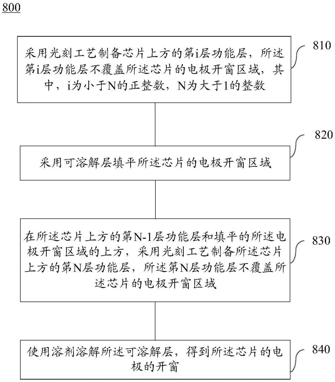 专利摘要显示,本申请实施例公开了一种芯片电极开窗的方法和芯片,所述方法包括:采用光刻工艺制备芯片上方的第i层功能层,所述第i层功能层不覆盖所述芯片的电极开窗区域,其中,i为小于N的正整数,N为大于1的整数;采用可溶解层填平所述芯片的电极开窗区域;在所述芯片上方的第N‑1层功能层和填平的所述电极开窗区域的上方,采用光刻工艺制备所述芯片上方的第N层功能层,所述第N层功能层不覆盖所述芯片的电极开窗区域;使用溶剂溶解所述可溶解层,得到所述芯片的电极的开窗。
