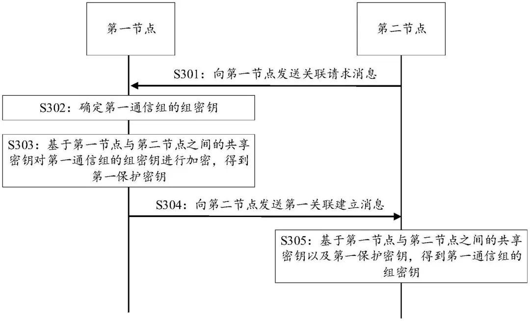 专利摘要显示,本申请实施例提供一种通信方法及装置,应用于支持短距离通信的节点中,例如蓝牙或者车载短距通信系统中,该方法包括:接收来自第二节点的关联请求消息;确定第一通信组的组密钥,其中,第一通信组为第二节点所在的通信组;基于第一节点与第二节点之间的共享密钥对第一通信组的组密钥进行加密,得到第一保护密钥;向第二节点发送第一关联建立消息,该第一关联建立消息包括第一保护密钥。采用本申请实施例,能够提高组播通信的安全性。