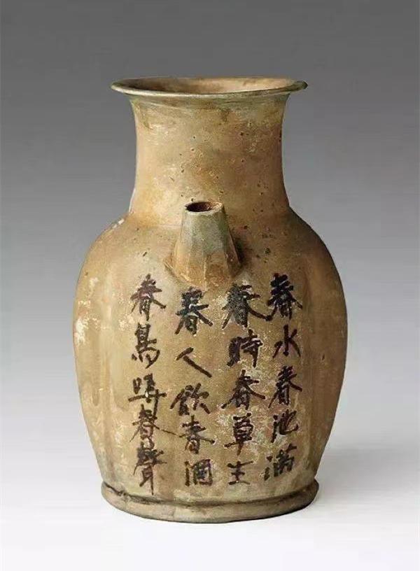 唐长沙窑青釉黑彩诗文执壶