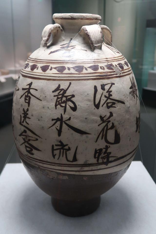 第四是抒情诗文。此类题材亦颇为常见,可以细分为抒发人生感叹、景物描述和爱情相思等几个小类别。其中唐长沙窑执壶、瓷枕、碗、碟的内壁上,宋、金、元磁州窑枕上最常见。如,唐长沙窑青釉褐彩执壶上有书:“春水春池满,春时春草生。春人饮春酒,春鸟弄春声”。这种以汉字楷书诗文的形式,描述春天的春水满池,草长莺飞,鸟儿鸣转,春花酿美酒的画面,即刻呈现在人的眼前。还有一首边塞诗“一日三场战,离家数十年。将军马上坐,将士雪中眠”,真实描绘了征战边塞将士的画面。其中有些诗意境颇为深远,与我们在书本上读到的诗词并不相上下。山西省河津窑北宋白地黑花枕上书有:“柴门掩石泉,夏日亦闻蝉。冷落花廷竹,馨香草里兰。”画面中无人,但有柴门,水声,蝉鸣,孤寂中有阵阵兰花幽香,沁人心脾。河北省磁县磁州窑的一件金代红绿彩小碗中,以红彩书写“有花方饮酒,无月不登楼”。河北省邯郸市磁州窑元代白地黑花诗文四系瓶,肩颈部四系间书写“春花秋月”四字,腹壁书“落花时节水流香,送客归来笑一场。不锁草堂取乐去,野雀偷笔学题墙”,行书,三字一行,排列自然,笔道洒脱率性,奔放有力。这是对时光飞逝的感叹。江西省高安窖藏中出土的一件元青花高足杯内壁书写有“人生百年常在醉,算来三万六千场”,草书,竖排,三行。书写笔法流畅,表达了对人生短暂的感叹。在抒情类的文字纹中,清乾隆景德镇官窑器中的乾隆帝御题诗颇为引人注目。如清乾隆窑变釉地金彩花卉御题诗纹瓶,以钧红窑变釉为地,腹部一面饰金彩花卉纹,另一面以金彩小楷书写乾隆御制诗“户外春光到几分,嫩红新绿变几分……”瓶的色彩华丽,字体规整,富有皇家艺术的华丽感。