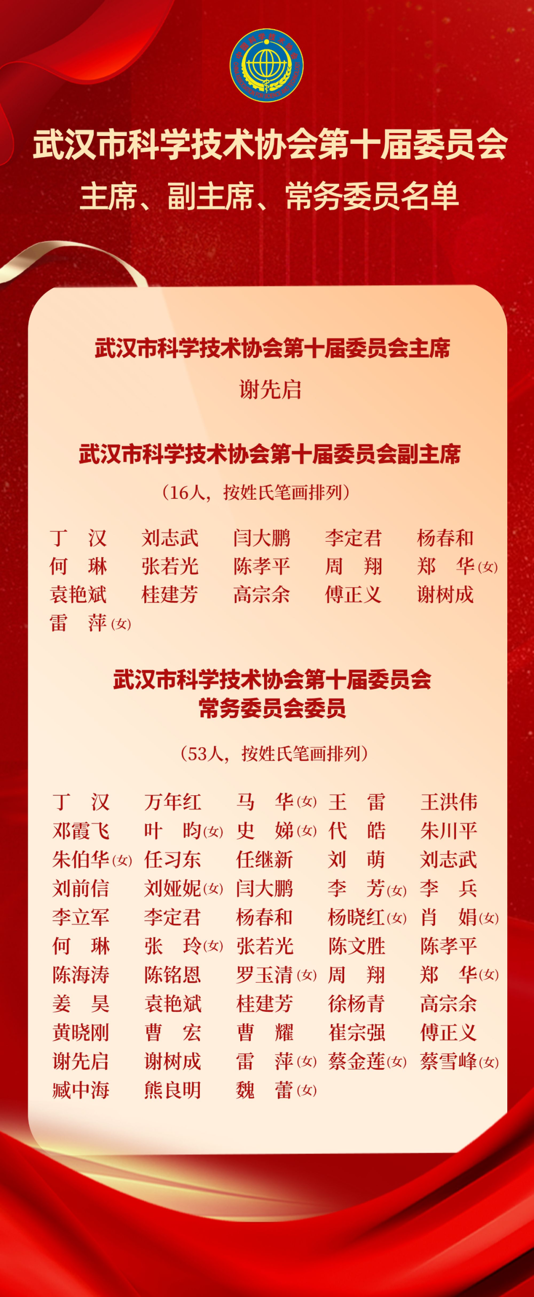 会议审议通过了市科协第十届委员会主席、副主席、常委选举办法,并现场投票选举中国工程院院士谢先启为市科学技术协会第十届委员会主席,丁汉等16人为市科学技术协会第十届委员会副主席,丁汉等53人为市科学技术协会第十届委员会常务委员。