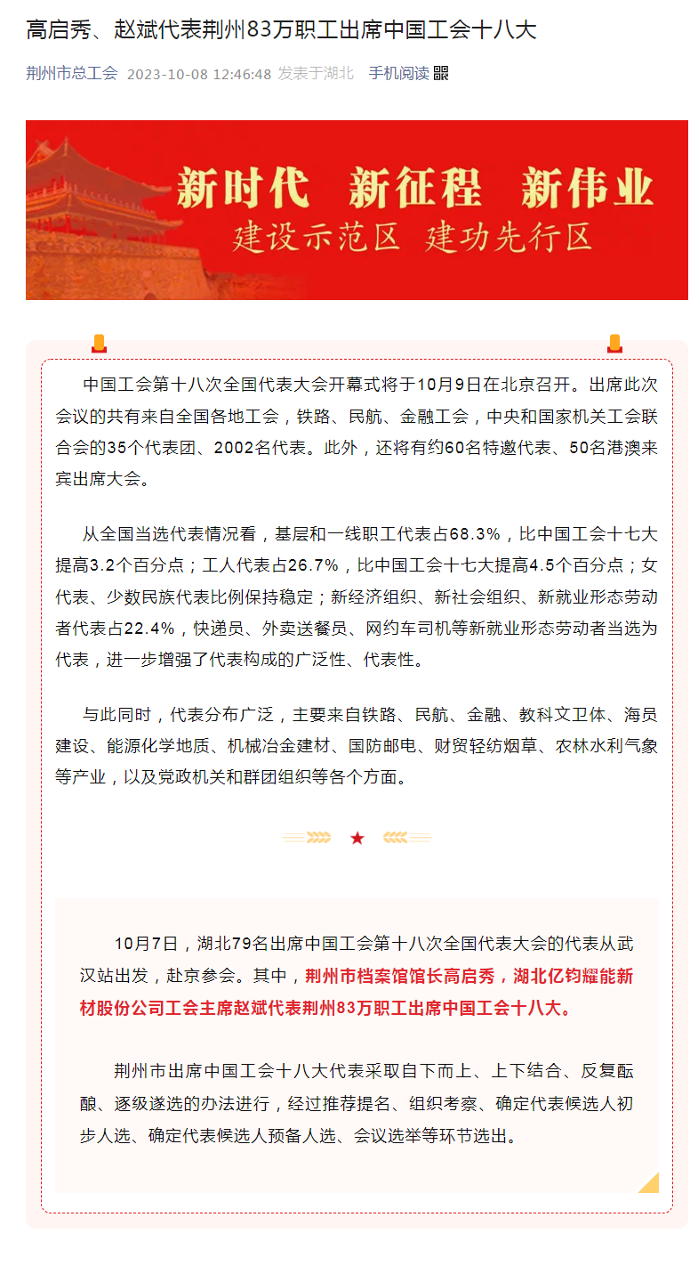 据“荆州市总工会”公众号报道,中国工会第十八次全国代表大会开幕式将于10月9日在北京召开。出席此次会议的共有来自全国各地工会,铁路、民航、金融工会,中央和国家机关工会联合会的35个代表团、2002名代表。此外,还将有约60名特邀代表、50名港澳来宾出席大会。10月7日,湖北79名出席中国工会第十八次全国代表大会的代表从武汉站出发,赴京参会。其中,荆州市档案馆馆长高启秀,湖北亿钧耀能新材股份公司工会主席赵斌代表荆州83万职工出席中国工会十八大。