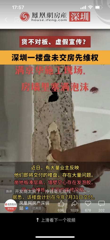 此前,凤凰网房产就曾跟进曝光了满京华云著项目疑似墙体塞满泡沫,涉嫌严重货不对板。虚假宣传,且业主与开发商多次沟通问题也未能得到处理。此外,据报道,2019年6月,多名满京华云晓业主投诉,称其交房出现房顶开裂,墙体渗水,厨房漏水,门框包边填充垃圾等严重质量问题。