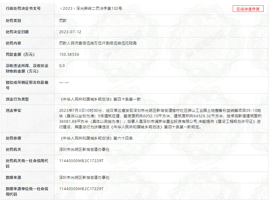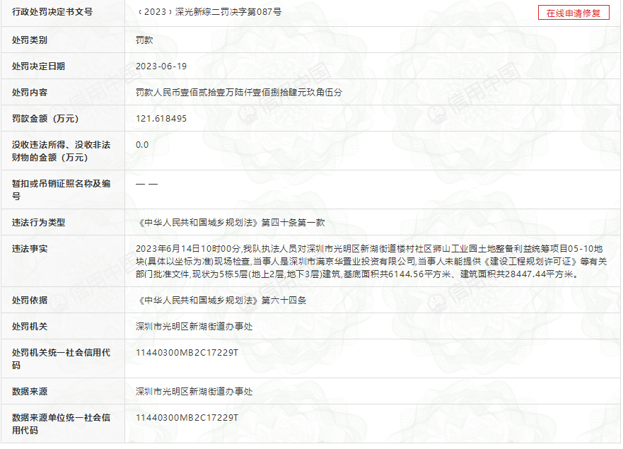 此外,据业内人士爆料,满京华金硕华府所在地块也存在违规施工被罚款的情况。据信用中国显示,满京华金硕项目05-10(金硕华府)地块,6月份与7月份,因两次都无《建设规划许可证》施工,被光明区新湖街道先后罚款121.6万元,150.5万元。