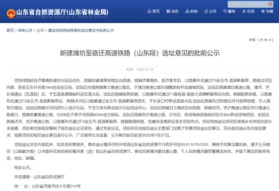 (2022年7月在山东省自然资源厅网站发布并在9月获得批复的《新建潍坊至宿迁高速铁路(山东段)选址意见的批前公示》)
