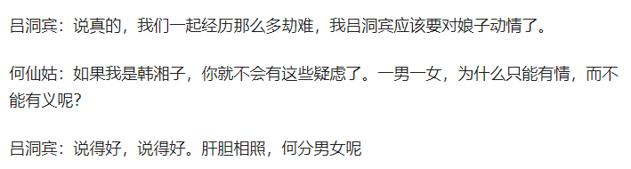 剧中的何仙姑曾问吕洞宾:为何男女之间只能有情,不能有义?
