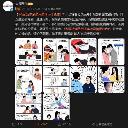 最近,央视一条“有的甜宠剧能不能别太性缘脑”的条漫,成功将“性缘脑”这一颇为冷门的词语,送上了热搜第一。