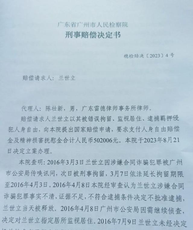 该《刑事赔偿决定书》显示,广州市人民检察院决定,向兰世立支付人身自由赔偿金39.4万元、精神损害抚慰金19.7万元,并以口头方式向兰世立赔礼道歉。在侵权行为直接影响范围内为兰世立消除影响、恢复名誉。