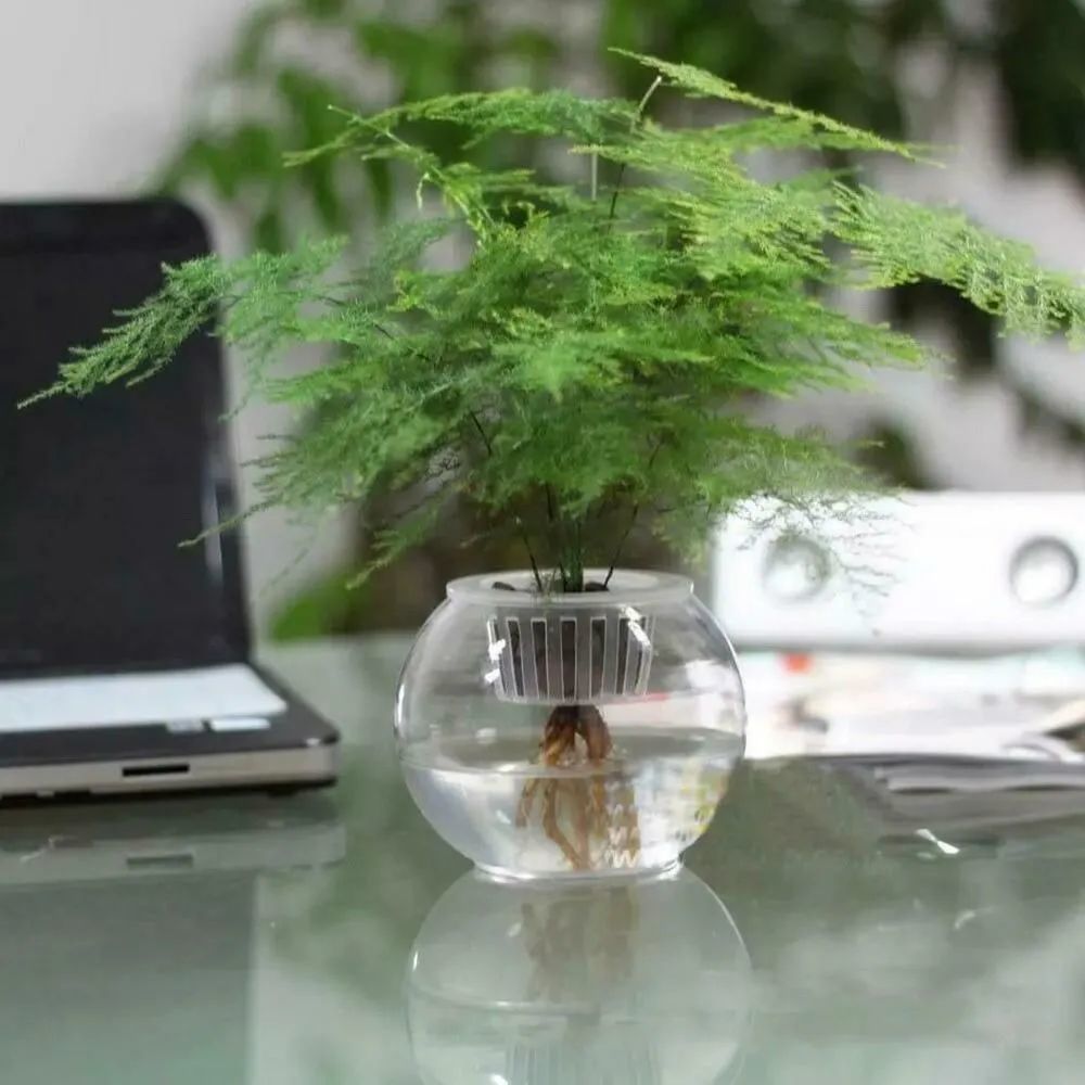 后期这些转水培的文竹,底部就会慢慢长出新的根系,根系会蔓延到水中,之后就会扎根到水中,这就证明水培养护文竹成功了,后期等水位降低后,直接添加清水就可以了,水位仍然要维持在定植篮以下。