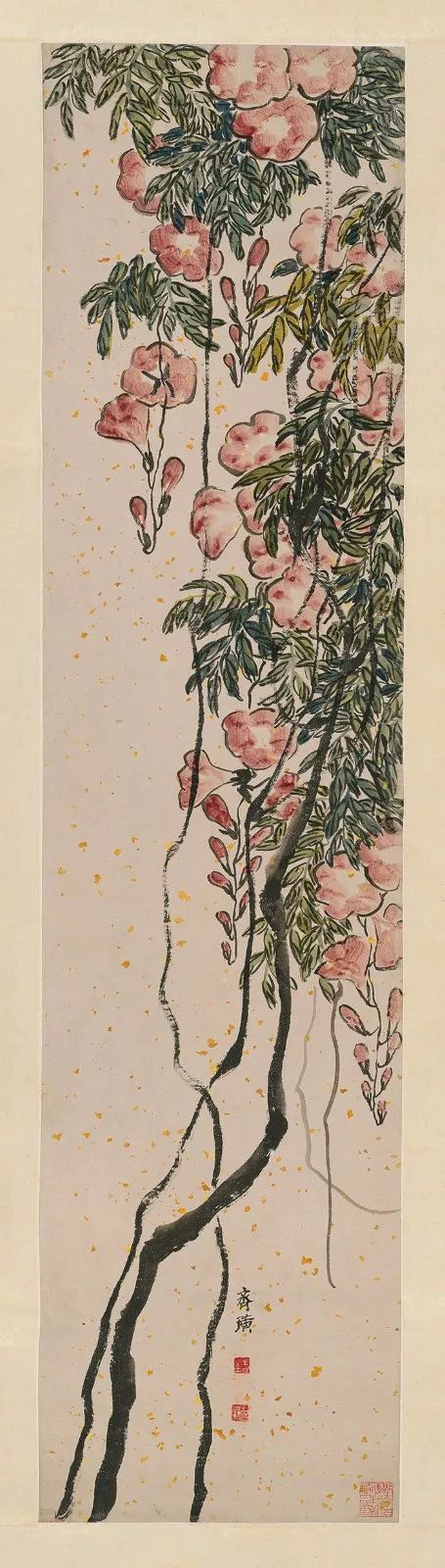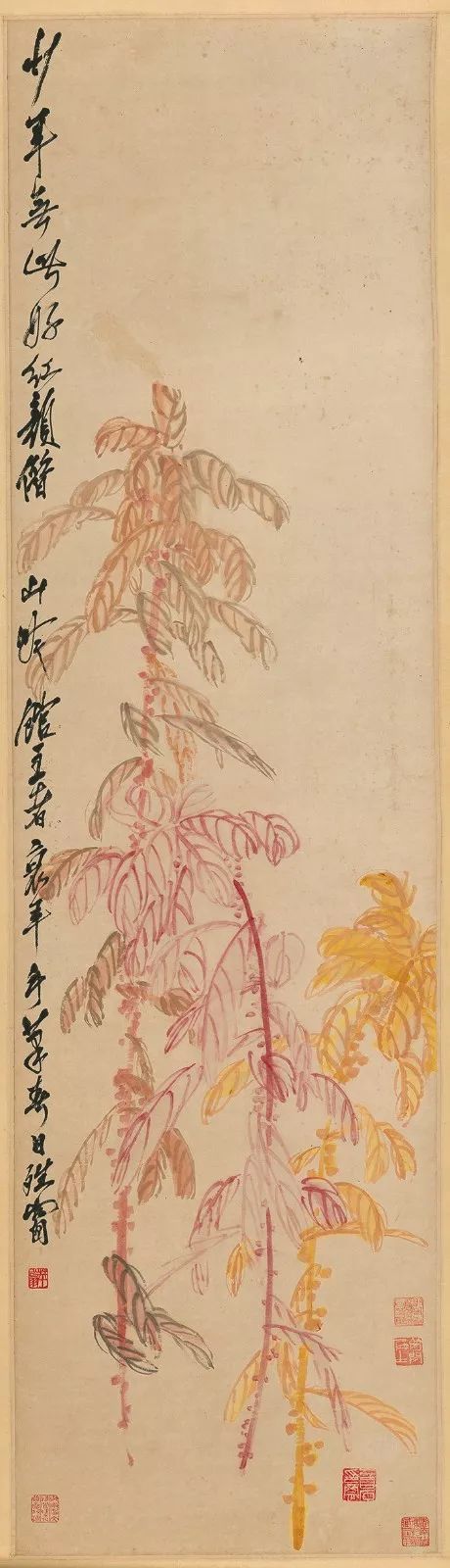 齐白石对雁来红的描绘不但数量大,而且独具特色,成为他的代表性题材。这幅雁来红立轴左侧有署款“少年无此好红颜。借山吟馆主者衰年手笔。春日晴窗。”纵观齐白石的一生,可谓大器晚成,“少年无此好红颜”也是齐白石对自己的中肯评价。