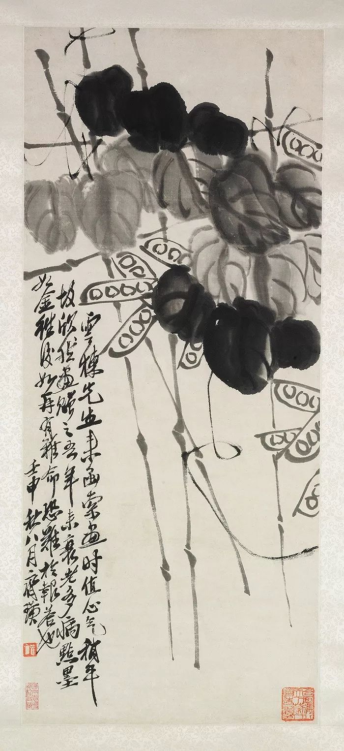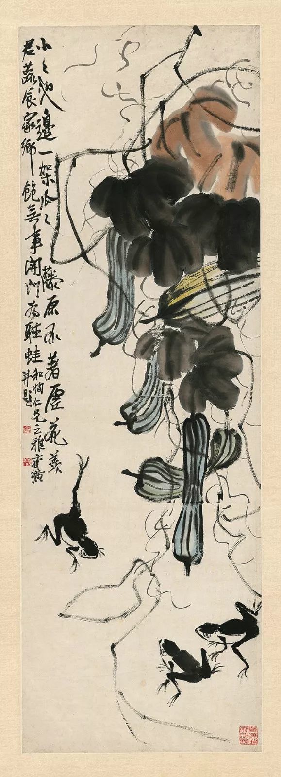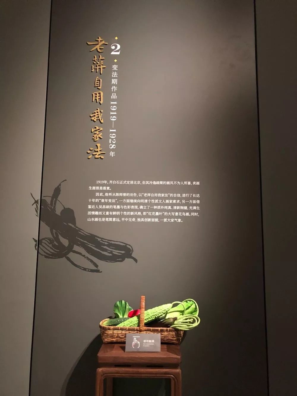 本单元展现了齐白石创作鼎盛期的作品。“衰年变法”之后,齐白石大器晚成,创造力旺盛,此后的二十年是他绘画的鼎盛期。人们所熟知的齐白石作品,多于出此时期,尤以水族的虾蟹、红花墨叶的花卉最广受关注,山水、人物岁数量较少,也是有很高质,最终呈现了我们所熟知的齐派风格,齐白石总结自己的创作心得,即“妙在似与不似之间,太似为媚俗,不似为欺世。”每次有好的作品产生,齐白石也会非常得意。在《瓜藤图轴》中,他毫不掩饰地自夸:“今之妙品也,呵呵。”