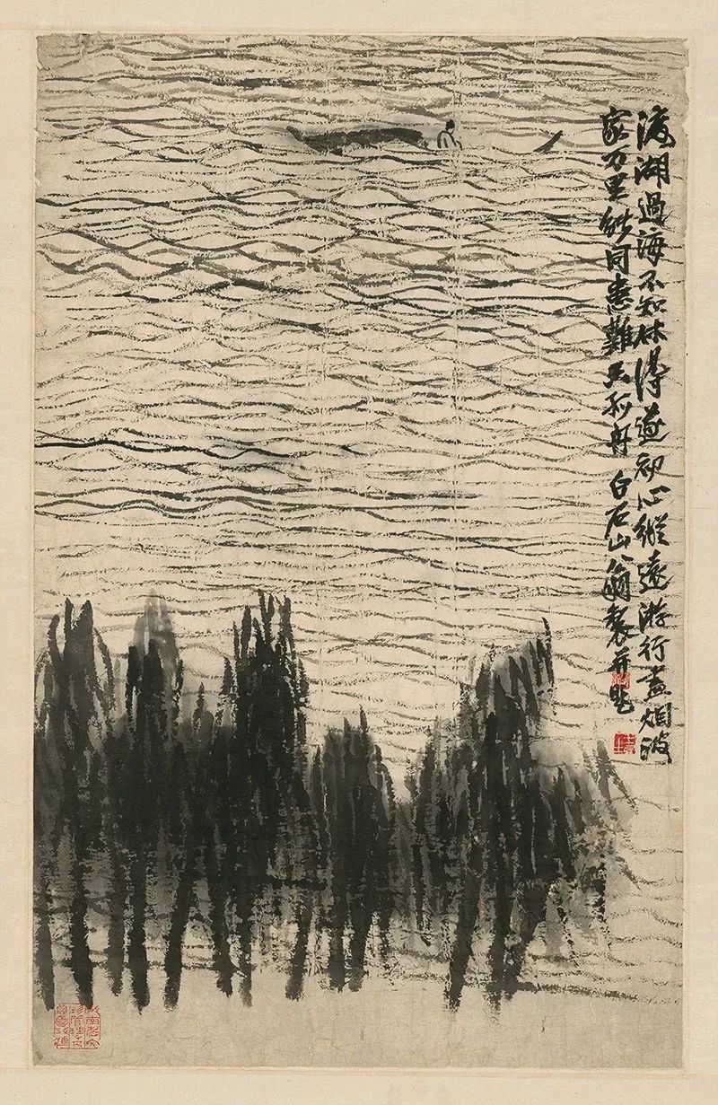 这幅《孤舟渡海立轴》画面主体为浩淼的水波,远处有一孤蓬小舟载一人于浪间沉浮,近景则为岸渚的一片树林。齐白石擅于画水,极富表现力。时而以大段空白来暗示江湖无边无涯,时而又以精细稠密的平行波纹,来刻画浩淼烟波和浮光动感。