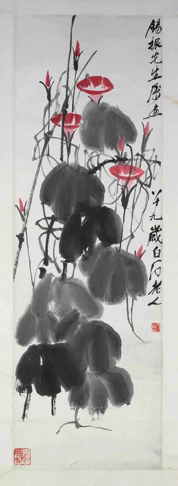 牵牛花为齐白石花卉中最为常见的题材之一,此幅牵牛花以湿墨画出牵牛花叶,不用墨线勾勒叶脉,加以藤蔓缠绕,簇拥着牵牛花朝上,面向天空。齐白石画牵牛花始于跟梅兰芳相识,梅兰芳家里种了不少的花木,光是牵牛花就有百来种样式,都是齐白石见所未见的品种,从此齐白石开始画牵牛花。梅兰芳对齐白石一直非常赏识。齐白石刚到京城郁郁不得志,但梅兰芳对他十分尊敬友爱。齐白石曾特意画了一幅雪中送炭图,送给梅兰芳,题了一诗,有句说:“而今沦落长安市,幸有梅郎识姓名。”