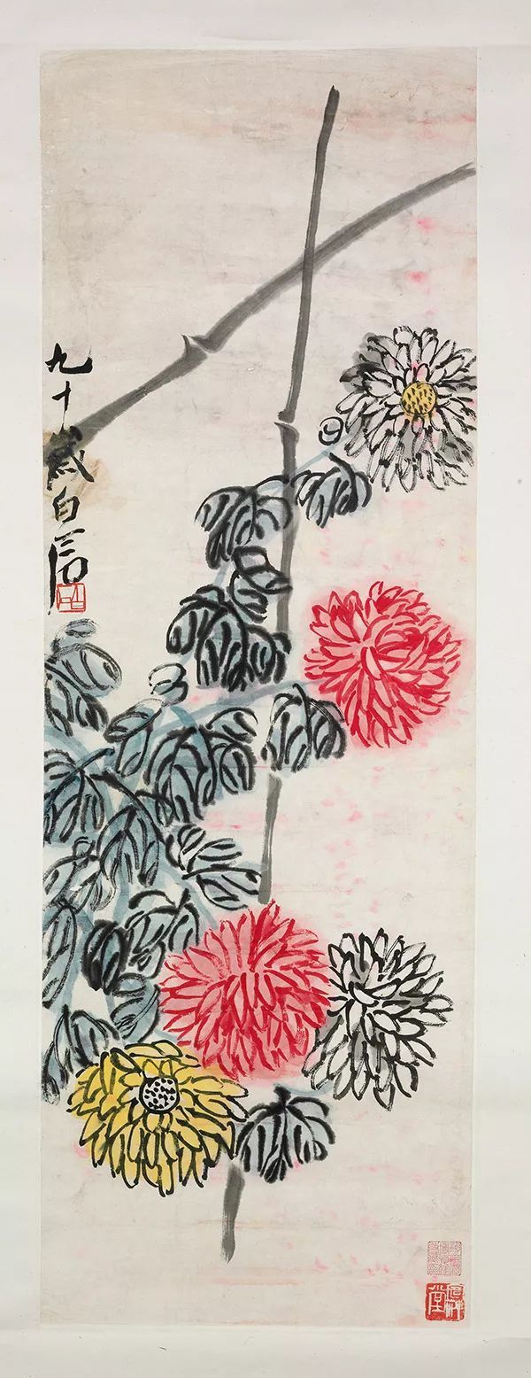 长寿、幸福、吉祥等是白石老人一生的渴求,菊花在万物萧疏的秋天开放,喻年高体健,有长寿之意。此幅画中菊花,以竹为架,画面随性,用笔凝练,色彩突出,画面艳丽浓烈,墨色均衡,以色彰墨,部分菊花着红色、黄色,并以红色、墨色线条勾勒,菊叶墨色有浓有淡,画面生动。