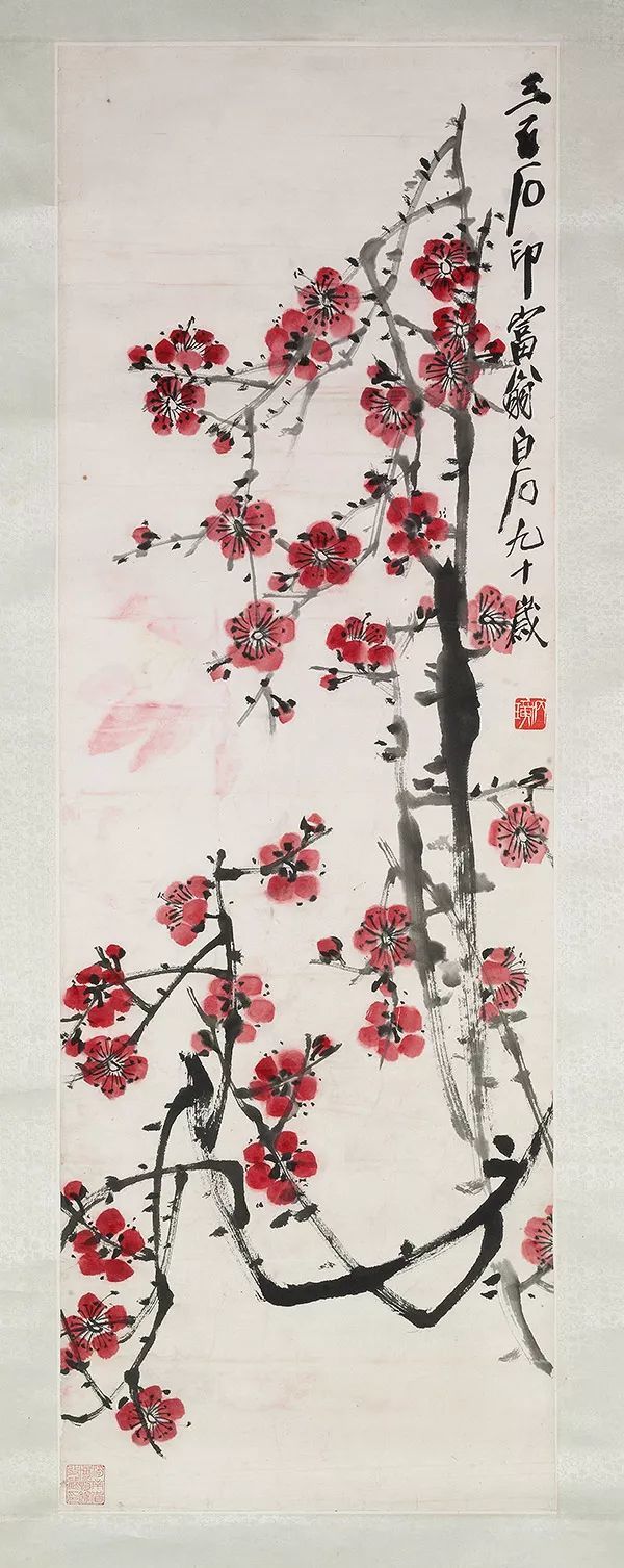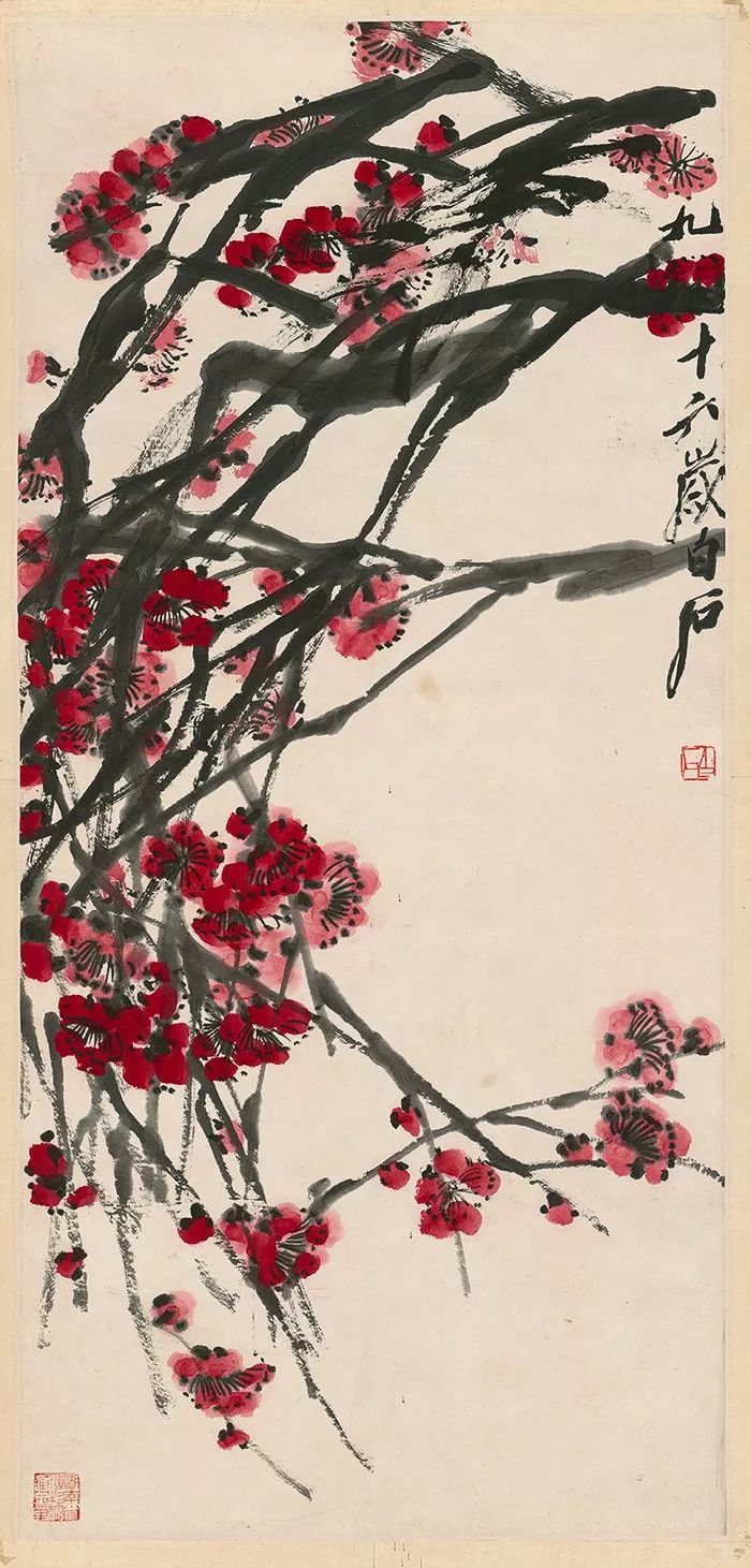 齐白石梅花也很有特色。他一生画的梅花也有很多。齐白石画梅,在技法上以凝重的金石笔法画枝干,以浓艳的洋红点花卉。齐白石所绘梅花除了取法尹金阳,又参照杨无咎、金农、吴昌硕等人,以60岁为分界线,60岁以前的梅花画面取景较阔,花枝繁茂,前后空间和枝干都有所交代。陈师曾认为工笔画梅花,费力又不好看,齐白石听取他的建议,改变画法;60岁以后,齐白石减少了写实的元素,画面简练很多,比较抽象。到了晚期,齐白石画梅写意,设色艳丽,粗枝大花。齐白石在九十六岁画了这幅红梅(下图)时,由于生理机能的衰退,手部常年颤抖,他已不能自如控制毛笔,线条与墨色更为粗犷,但依然能感受到他苍劲的行笔和新颖的布局。