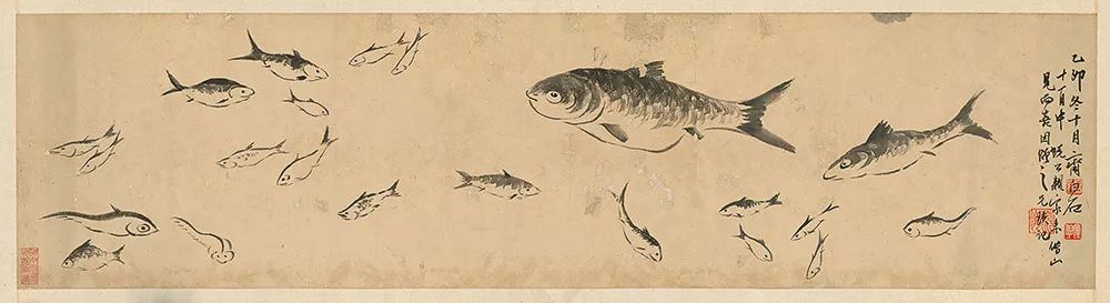 此幅鱼乐图描绘了大大小小22条鱼在水中游动的情景,姿态各异,栩栩如生。其中最大的那条鱼,翻着白眼,是致敬八大山人的画法。这一时期,齐白石受八大的影响很深,他后来有诗“青藤雪个远凡胎,老缶衰年别有才。我愿九泉为走狗,三家门下转轮来。”其中,雪个即是八大山人。