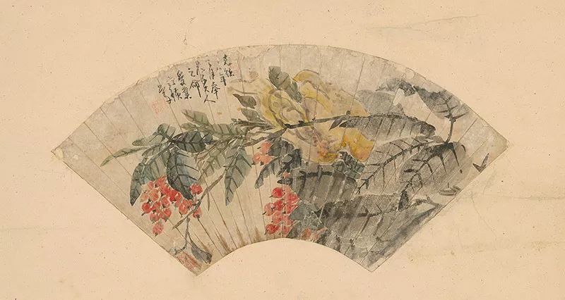 此件佛手山茱萸扇面为目前发现的齐白石有年款作品中最早的一件。款中题“光绪□八年”有两种可能,一为十八年(1892),一为二十八年(1902)。从款书风格、水准看,应是1892年(30岁)所作。题款中的“夫子”为胡沁园,他收留齐白石学习诗文绘画,为他聘请老师,同时也是齐白石的第一位花鸟画老师。他是齐白石从木匠走向职业画家的恩师。