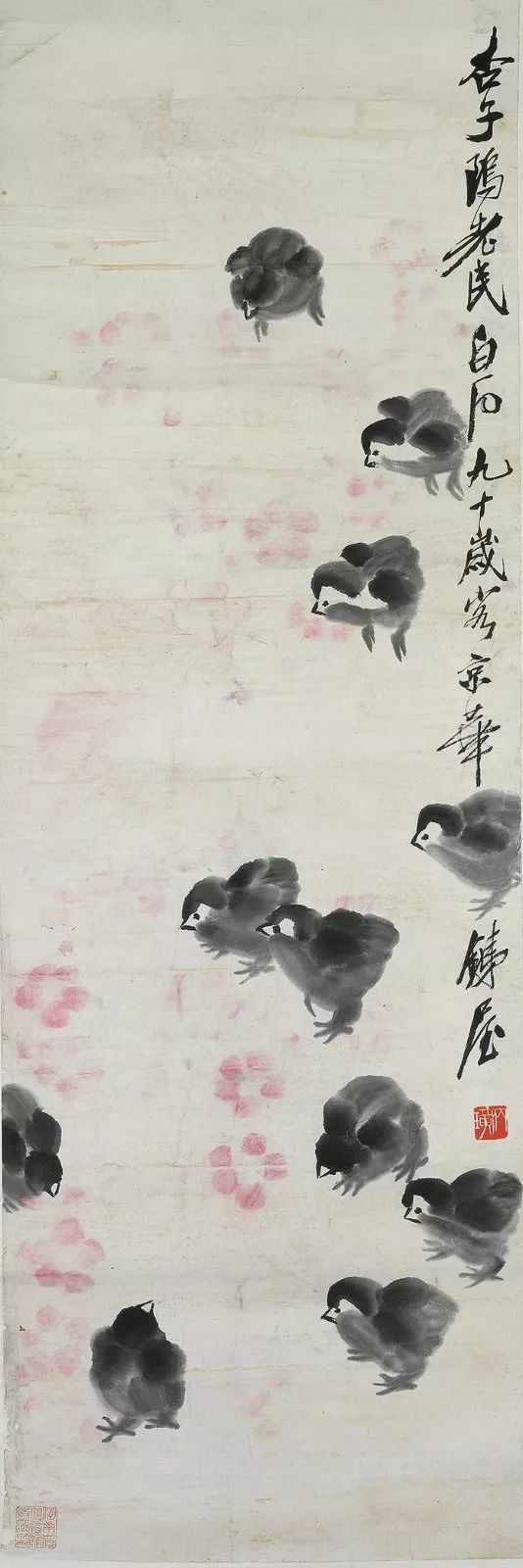乡村题材是齐白石区别于其他艺术家的一个重要特征,同时也造就了他在绘画史上独特的地位。画中,齐白石熟练地运用墨色的浓淡干湿,巧妙地把雏鸡身上绒毛质感和各种神情动态都画出来了。画中落款“杏子坞老民白石九十岁客京华铁屋。”,其中“杏子坞老民”充满齐白石对家乡的认同和思念。“京华铁屋”是指齐白石晚年在北京因为时局动荡,害怕小偷光顾,所以在廊前加置铁栅栏,故名“京华铁屋”。齐白石在35岁以前没离开过家乡,1917年定居北京以后很少回湘潭。他对于家乡的思念不仅体现在他的回忆录中,更加体现在他的绘画作品中。