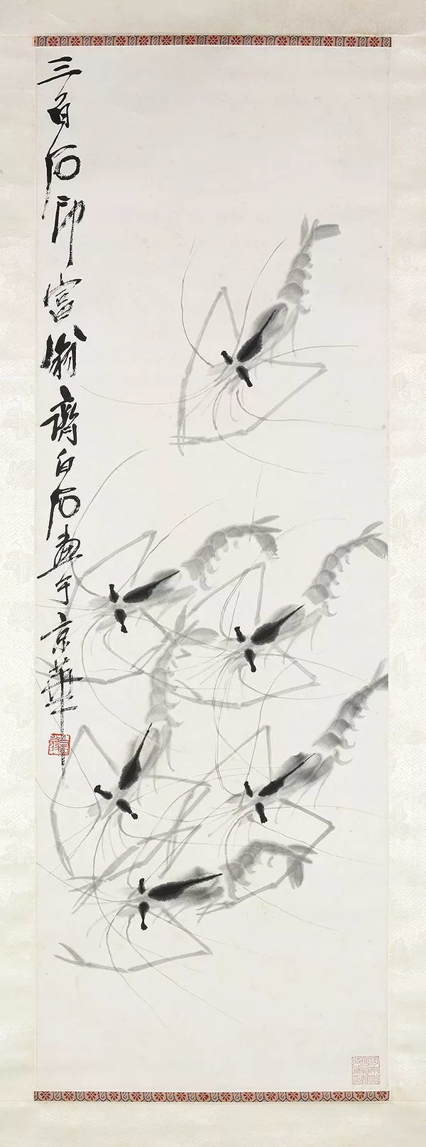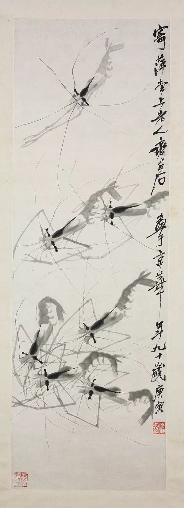 虾是齐白石的代表作之一。在此次展览中,第一部分和第四部分均有该题材作品展出。这两幅作品均为齐白石九十岁左右创作,可以清晰看到齐白石水墨画虾的演变:早期画虾参照前人,中期虽然外形生动但是墨色缺乏层次,晚期进一步概括、提炼形象,特别是在虾头的淡墨中加入一笔浓墨,体现虾头的透明感。传神写照皆来自于细心观察。齐白石早年生活在乡间,多处可见小虾。定居北京后,他在画案上的水盂中蓄养了长臂青虾,日复一日进行反复的观察和写生,对虾的结构和动态默记于心。经过无数次的反复改进,齐白石晚年画的虾达到了炉火纯青的境界。