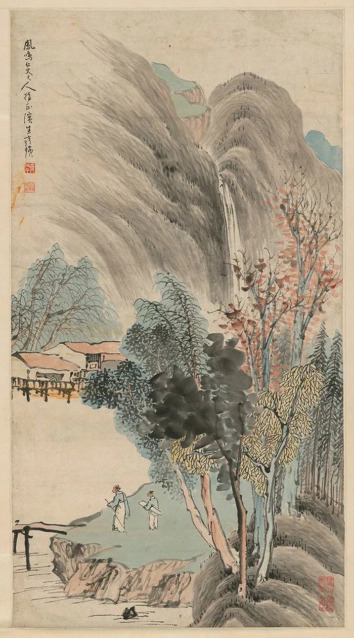 这幅画中描绘了秋天一位士人携童子渡桥访友或归家的情景。此画中勾皴点染皆亦步亦趋,是齐白石学习“四王”山水的例证。后来,齐白石摒弃了这种程式化的画法,强调表达自己的情感与体验,可谓是创新力极强。整幅图,其构图、用笔皆合乎法度,设色清丽,用笔熟练。