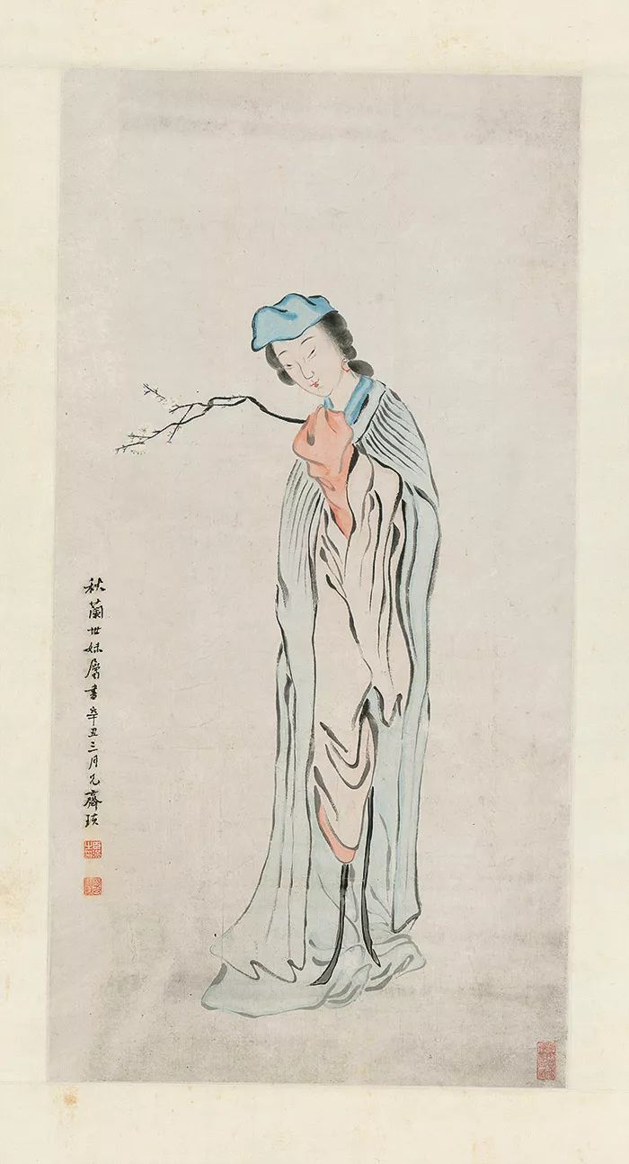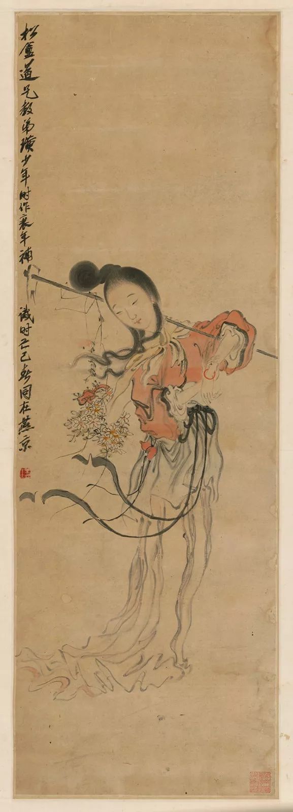 该画作于1901年,当时齐白石39岁,处在远游的前夕。此时的他从事职业创作近10年,常年读书、作诗、习字、画画,身上沾染了更多的文人气息。从整体上看,比《黛玉葬花图》多了几分清雅之气。