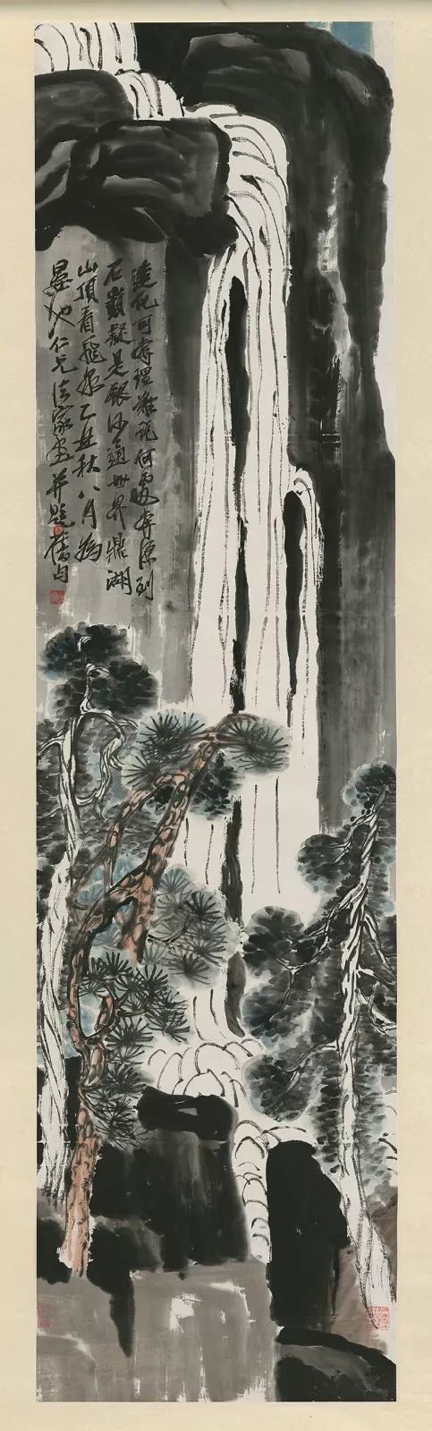 在齐白石变法期中,即使是那些构图繁密的作品,细数之下,所绘对象也极简少。这幅《飞瀑图》是一幅高达178厘米的大轴,截取了瀑布的一角,近景有巨石数块,并绘松柏三株。中景为峻峭的陡壁山,泉从上奔泻而下,很有气势。在构图取景上,齐白石别出新意,这种“仰望而不见顶”的描写法,增加了画面的联想空间,拓展了作品的意境。