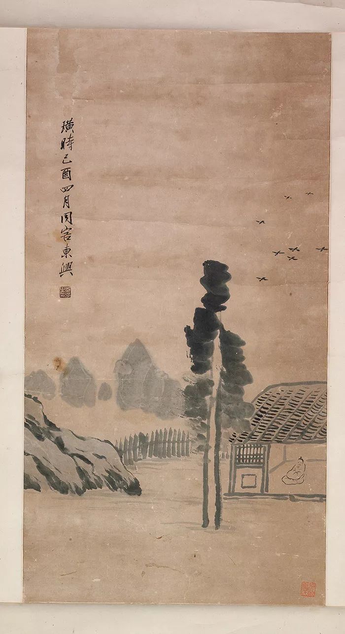 1909年(己酉)初至夏天,齐白石再次赴钦州,为郭葆生代笔作画。期间曾到东兴。此图是年作于东兴。较之齐白石30多岁时的风格,此件山水画已发生转变,构图高度提炼,笔墨也趋于简单,整幅画有一股文人戏墨的意味,可以看出八大、金农山水的影子。远游时期,齐白石在与友人的交流中,临仿了更多明清名家的作品,并快速地运用到自己的创作中。