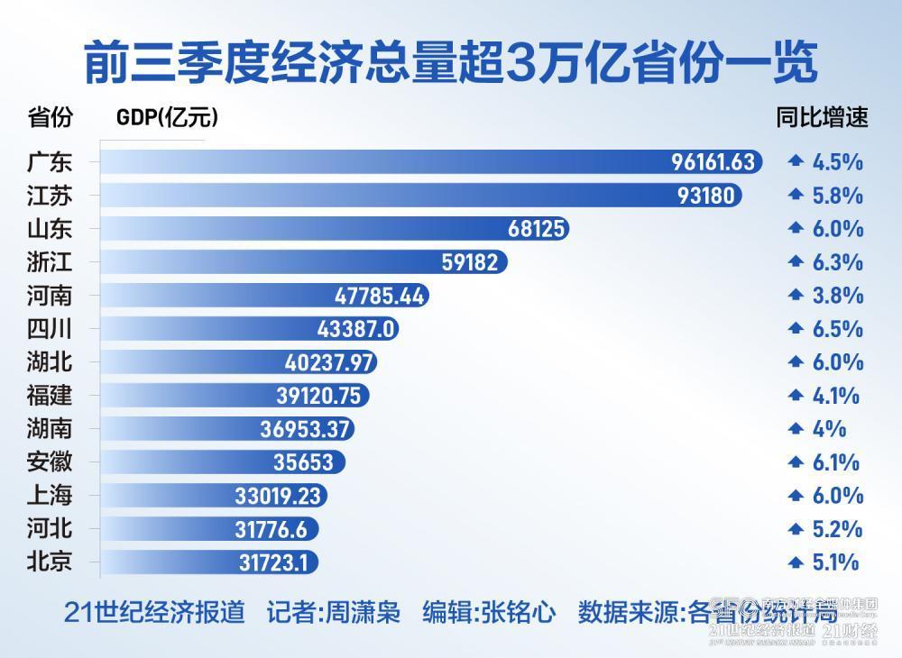 21世纪经济报道记者梳理发现,前三季度GDP规模超过3万亿的省份有13个,其中广东、江苏GDP超9万亿元,山东超6万亿元,浙江接近6万亿元,河南、四川、湖北GDP规模超过4万亿元,福建、湖南、安徽、上海、河北、北京的GDP超过3万亿元。