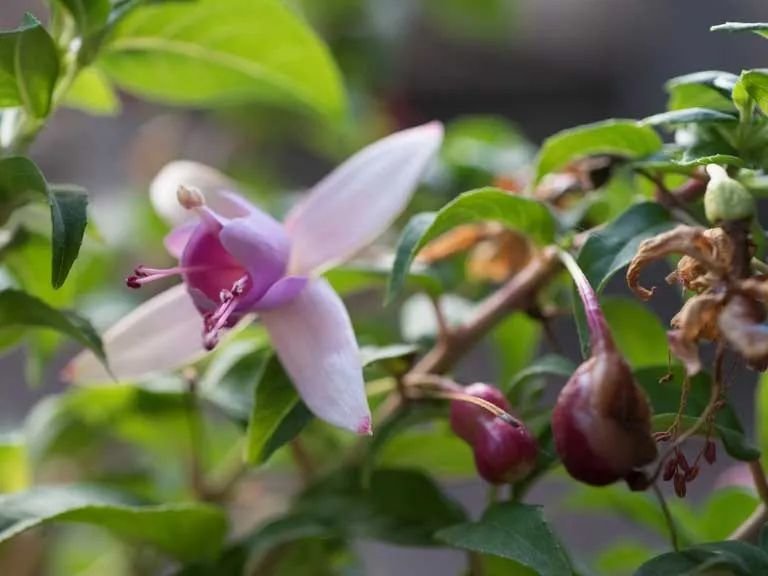 这是我们刚刚从花市或花店里买回来的盆栽倒挂金钟,无论养护环境多么好,也会出现掉叶子的情况,因为这些刚买回来的盆栽需要短暂的服盆期,在此期间叶子会不断掉落,花瓣也会掉,这个时候一定不要给它施肥,否则会导致状况变得越来越差。