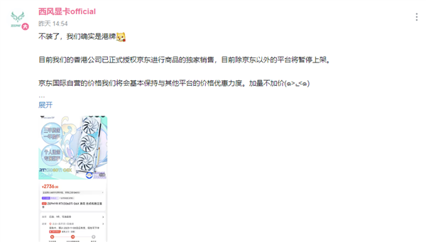 西风显卡自承为港资品牌,目前已经在京东国际上架产品的独家销售,除京东以外的平台将暂停上架。