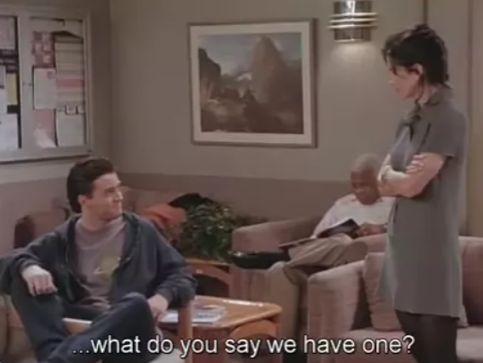 他跟Monica初次吵架后以为要就此分手了,Monica大笑说每次吵架就分手,那你跟任何人关系都没法延续——说完这句话后她恍然大悟,明白了Chandler为何任何关系都不长久。